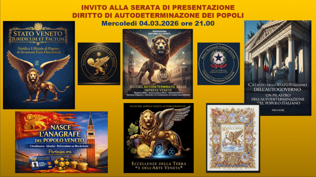 Siete invitati MERCOLEDI 04.03.26 alle ore 21.00, alla riunione zoom del CLNI e dello “Stato Veneto in autodeterminazione” in cui approfondiremo i seguenti punti: